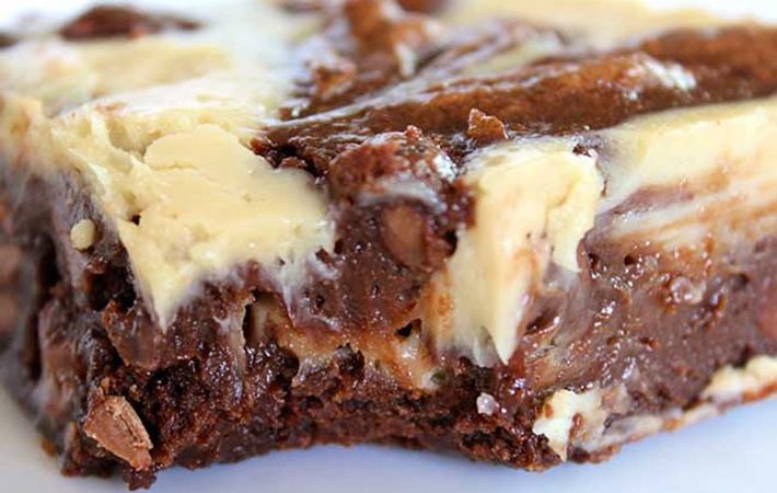 Spread half of chocolate batter (about 1 1/4 cups) in prepared pan. Using a rubber spatula, spread cream cheese mixture over chocolate batter. Spoon remaining chocolate batter over top of cream cheese mixture. Using the tip of a knife, gently swirl through the batter, forming marble design. Bake brownies until tester inserted into the center comes out with a few moist crumbs attached, about 30 minutes.